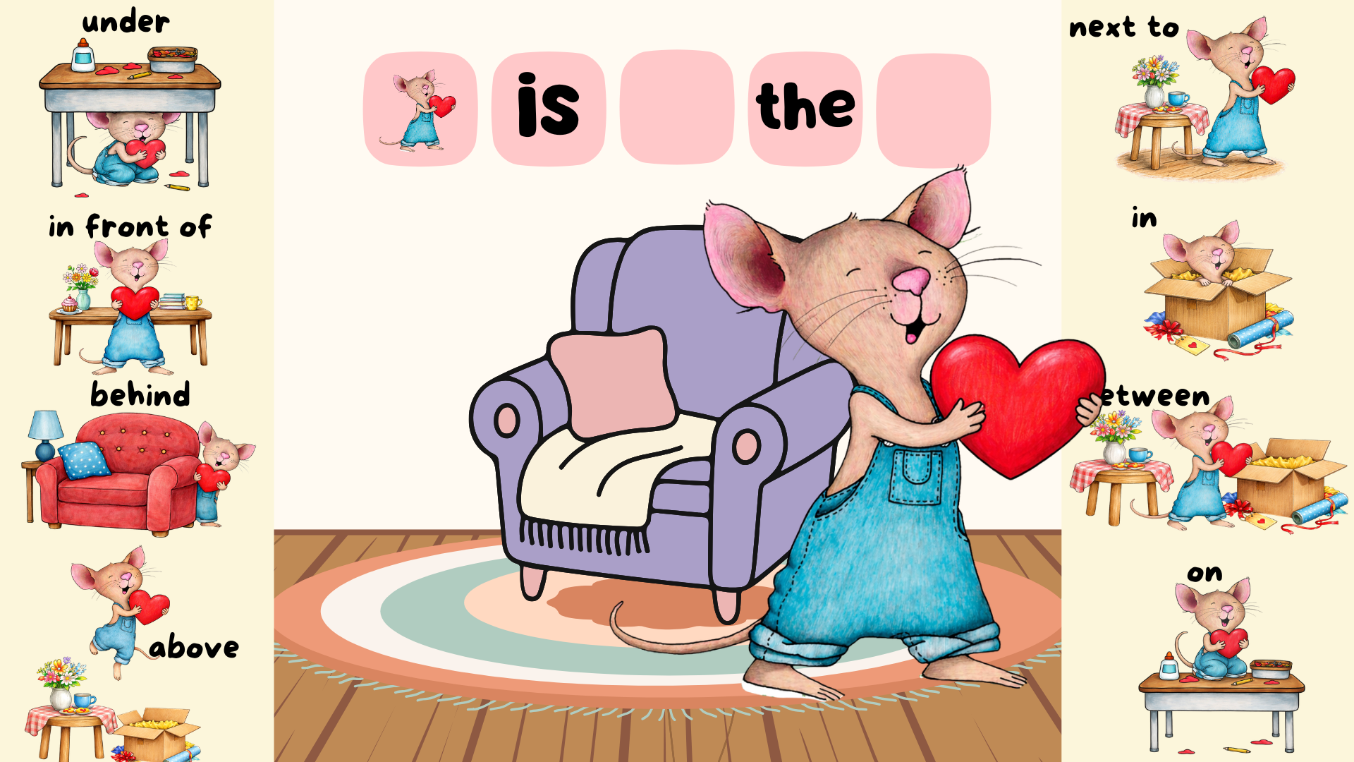 Practise prepositions of place with this fun activity based on the story Happy Valentine’s Day, Mouse!. 💖