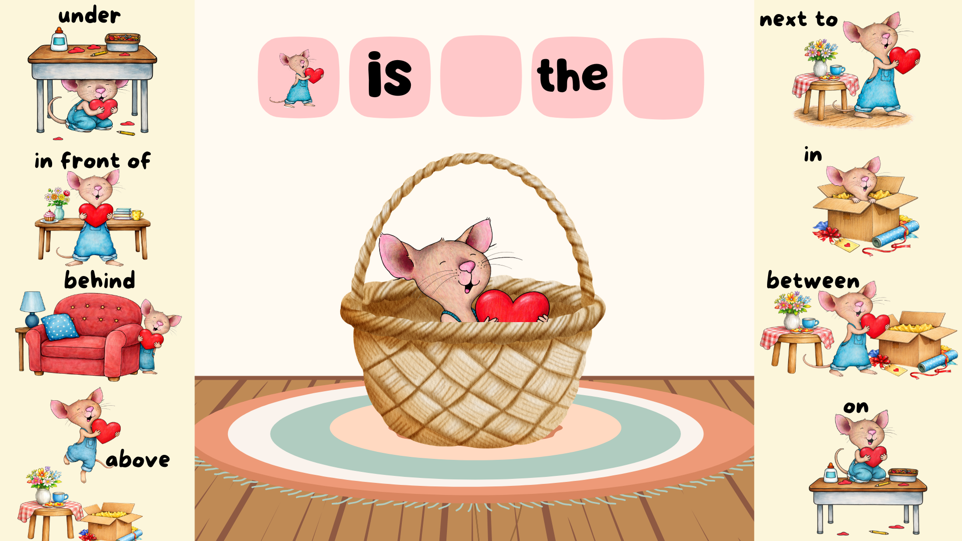 Practise prepositions of place with this fun activity based on the story Happy Valentine’s Day, Mouse!. 💖
