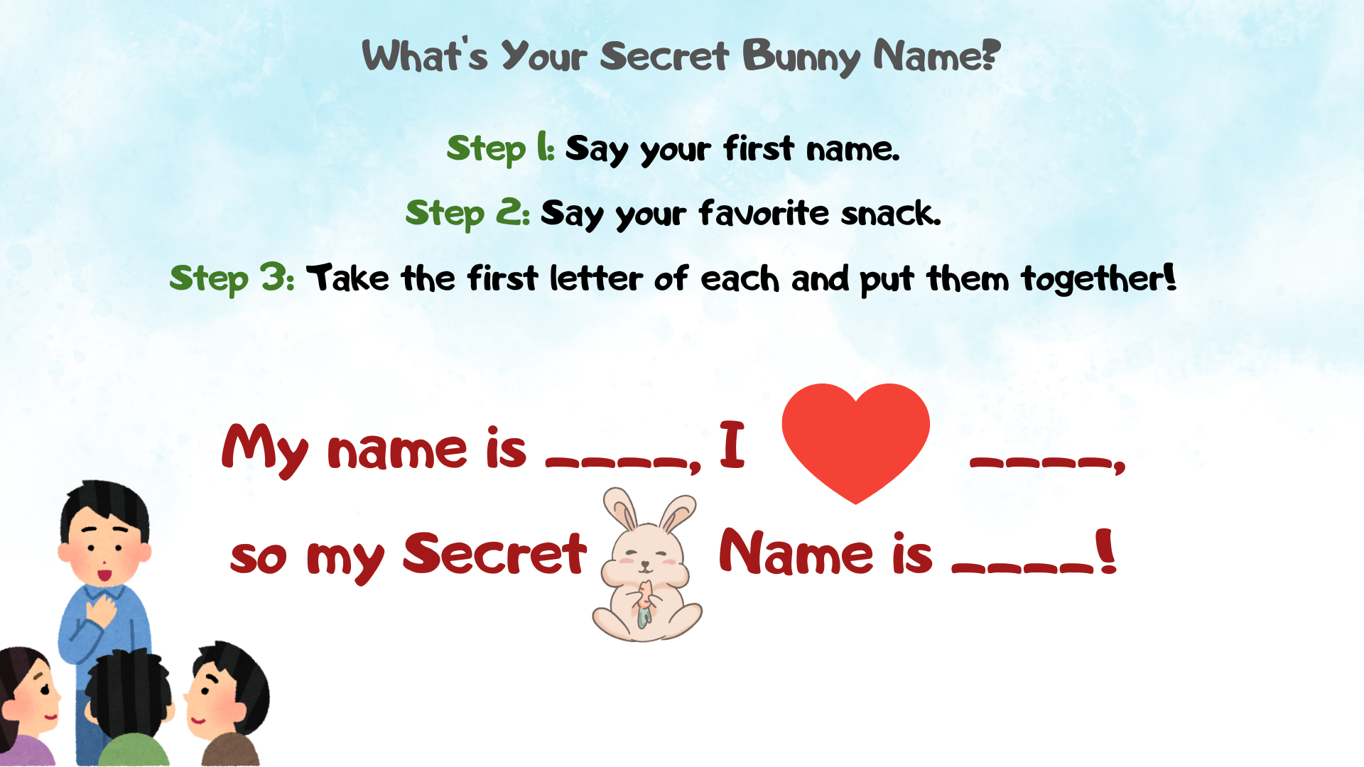 • Step 3: Combine them to reveal your secret identity! (e.g., "Hopper Cotton-Tail" or "Sparkle Jellybean")