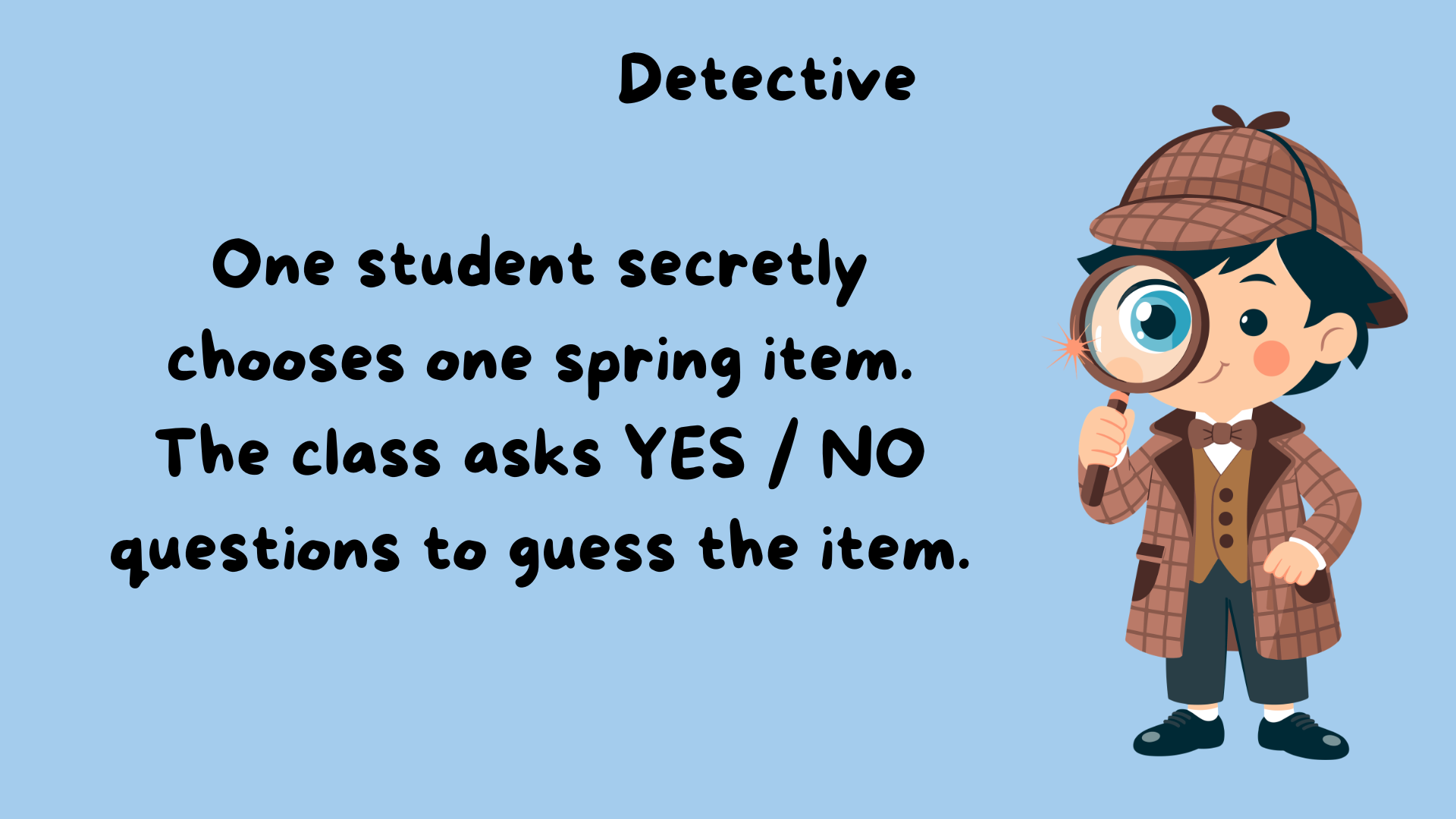 - The Secret Agent: One student (the Detective) secretly chooses a specific spring-themed item from the visual board.