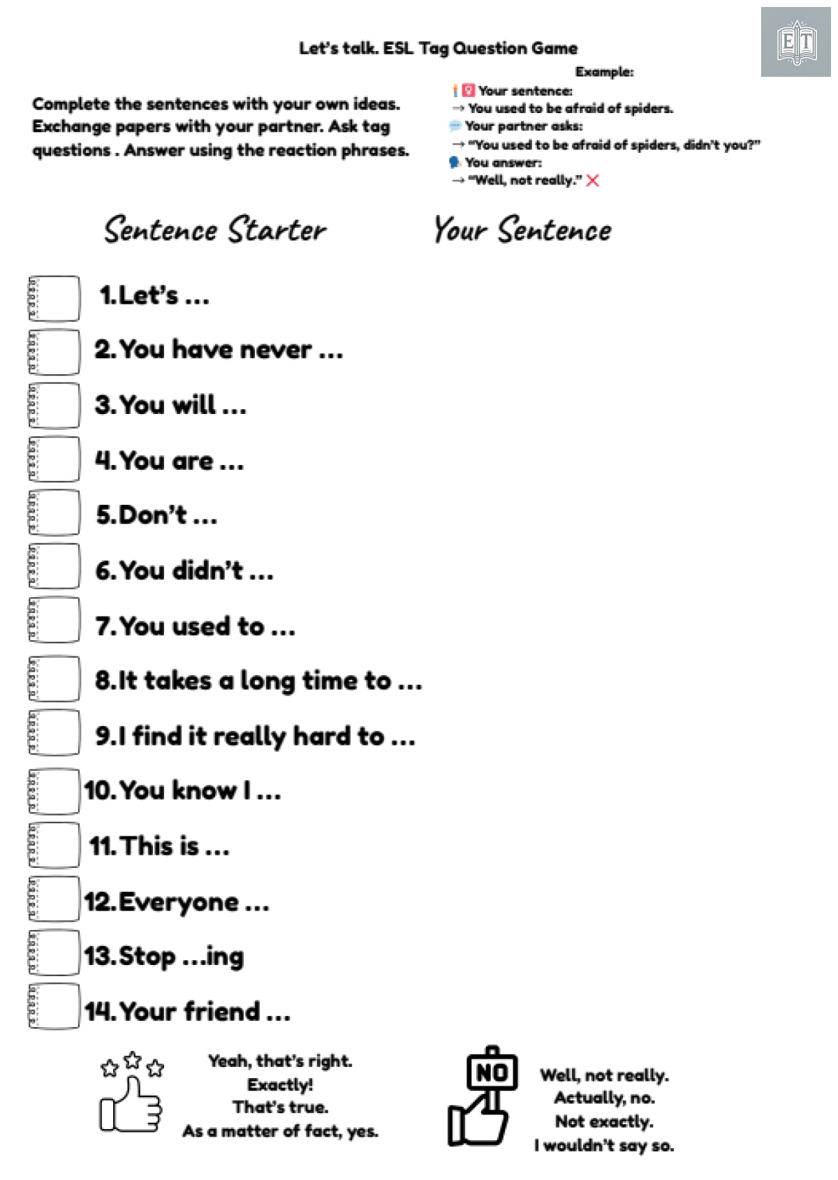 🗣 Let’s Talk: Tag Questions Game helps learners practise question tags and natural reactions like “Yeah, that’s right!” or “Well, not really.” Students complete prompts, exchange papers, and ask questions such as “You used to be afraid of spiders, didn’t you?”