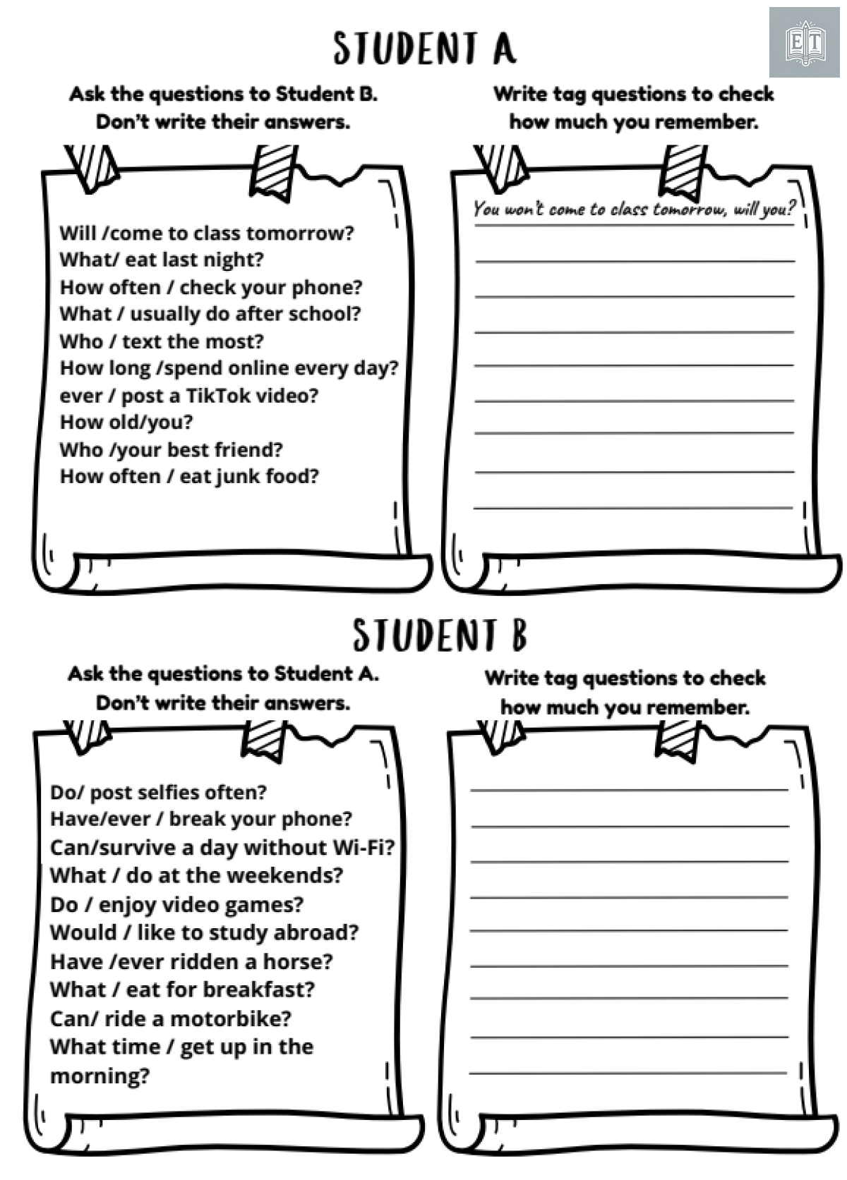 🎲 This Tag Questions Game combines grammar, memory, and speaking practice. Students form and ask questions, then create tag questions to check their memory — e.g. “You won’t come to class tomorrow, will you?”
